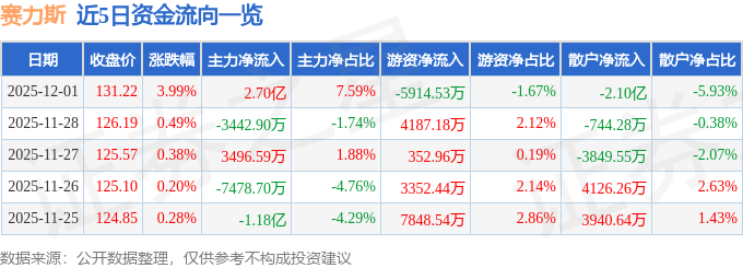 证券之星消息,截至2025年12月1日收盘,赛力斯(601127)报收于131.22元,上涨3.99%,换手率1.81%,成交量27.36万手,成交额35.49亿元。