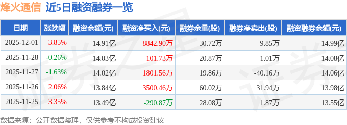 烽火通信融资融券信息显示,融资方面,当日融资买入2.0亿元,融资偿还1.11亿元,融资净买入8842.9万元,连续3日净买入累计1.07亿元。融券方面,融券卖出12.43万股,融券偿还2.58万股,融券余量30.72万股,融券余额729.31万元。融资融券余额14.99亿元。