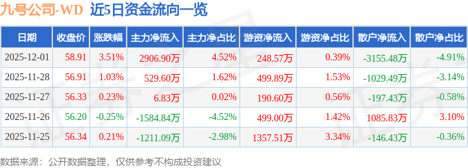 证券之星消息,截至2025年12月1日收盘,九号公司(689009)报收于58.91元,上涨3.51%,换手率1.98%,成交量10.94万手,成交额6.43亿元。