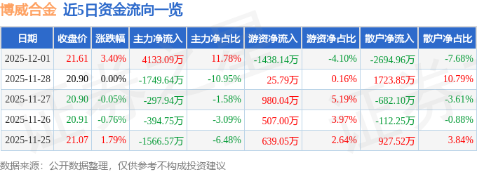 证券之星消息,截至2025年12月1日收盘,博威合金(601137)报收于21.61元,上涨3.4%,换手率1.99%,成交量16.33万手,成交额3.51亿元。