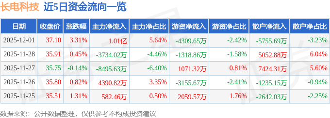 证券之星消息,截至2025年12月1日收盘,长电科技(600584)报收于37.1元,上涨3.31%,换手率2.7%,成交量48.4万手,成交额17.84亿元。