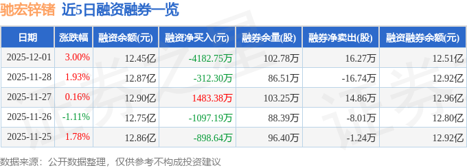 驰宏锌锗融资融券信息显示,融资方面,当日融资买入7662.61万元,融资偿还1.18亿元,融资净偿还4182.75万元。融券方面,融券卖出19.02万股,融券偿还2.75万股,融券余量102.78万股,融券余额671.15万元。融资融券余额12.51亿元。
