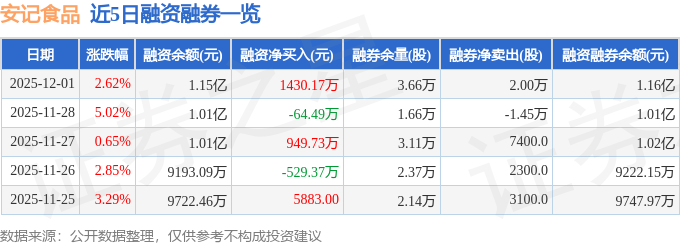 安记食品融资融券信息显示,融资方面,当日融资买入3673.85万元,融资偿还2243.67万元,融资净买入1430.17万元。融券方面,融券卖出2.31万股,融券偿还3100.0股,融券余量3.66万股,融券余额48.68万元。融资融券余额1.16亿元。