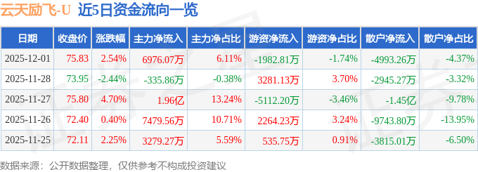 证券之星消息,截至2025年12月1日收盘,云天励飞(688343)报收于75.83元,上涨2.54%,换手率5.83%,成交量15.37万手,成交额11.42亿元。