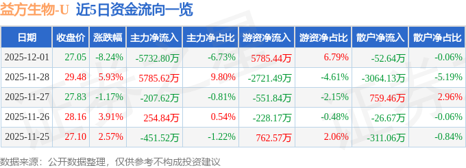 证券之星消息,截至2025年12月1日收盘,益方生物(688382)报收于27.05元,下跌8.24%,换手率7.55%,成交量31.53万手,成交额8.52亿元。