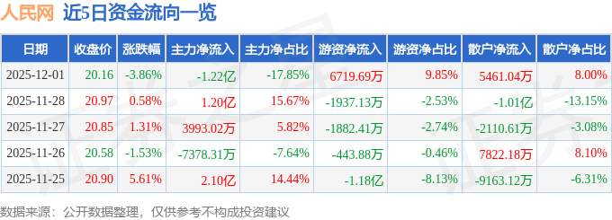 证券之星消息,截至2025年12月1日收盘,人民网(603000)报收于20.16元,下跌3.86%,换手率3.06%,成交量33.83万手,成交额6.82亿元。