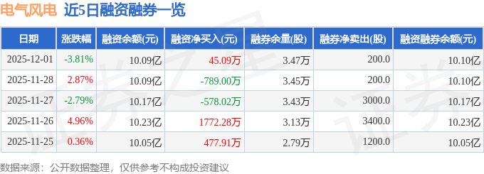 电气风电融资融券信息显示,融资方面,当日融资买入3747.98万元,融资偿还3702.89万元,融资净买入45.09万元。融券方面,融券卖出200.0股,融券偿还0.0股,融券余量3.47万股,融券余额58.68万元。融资融券余额10.1亿元。