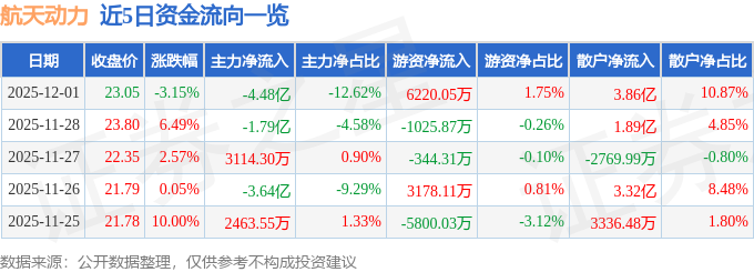 证券之星消息,截至2025年12月1日收盘,航天动力(600343)报收于23.05元,下跌3.15%,换手率23.1%,成交量147.43万手,成交额35.49亿元。