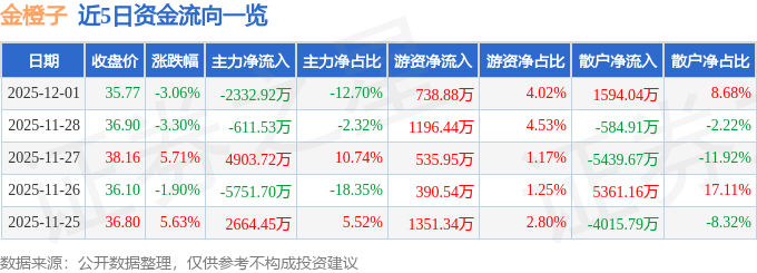 证券之星消息,截至2025年12月1日收盘,金橙子(688291)报收于35.77元,下跌3.06%,换手率4.99%,成交量5.12万手,成交额1.84亿元。