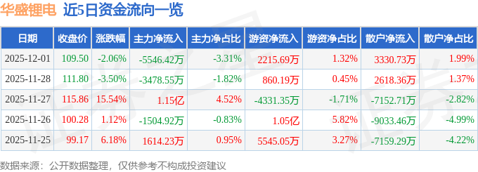 证券之星消息,截至2025年12月1日收盘,华盛锂电(688353)报收于109.5元,下跌2.06%,换手率12.2%,成交量14.53万手,成交额16.73亿元。
