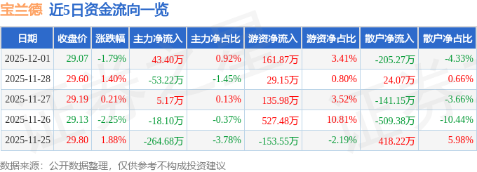 证券之星消息,截至2025年12月1日收盘,宝兰德(688058)报收于29.07元,下跌1.79%,换手率2.07%,成交量1.61万手,成交额4740.57万元。