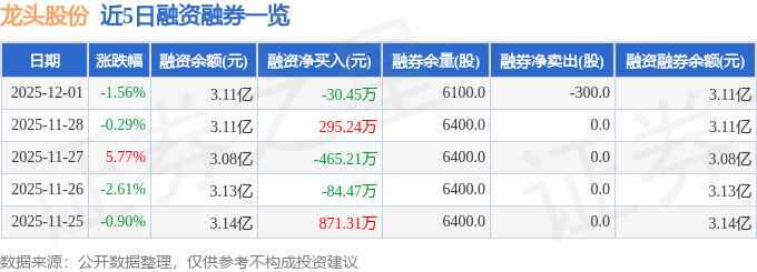 龙头股份融资融券信息显示,融资方面,当日融资买入2475.02万元,融资偿还2505.47万元,融资净偿还30.45万元。融券方面,融券卖出0.0股,融券偿还300.0股,融券余量6100.0股,融券余额6.14万元。融资融券余额3.11亿元。