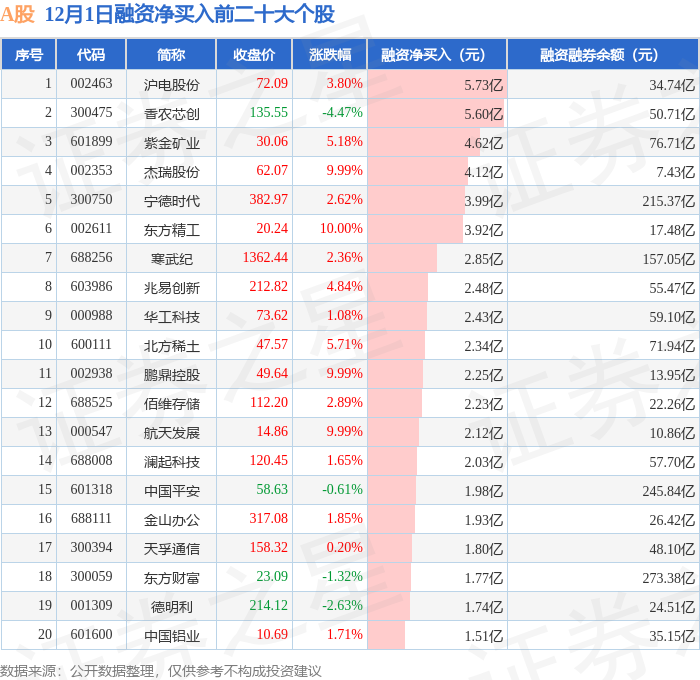 A股融资净买入前三分别为:沪电股份(002463)融资净买入5.73亿元、香农芯创(300475)融资净买入5.6亿元、紫金矿业(601899)融资净买入4.62亿元,前20具体见下表: