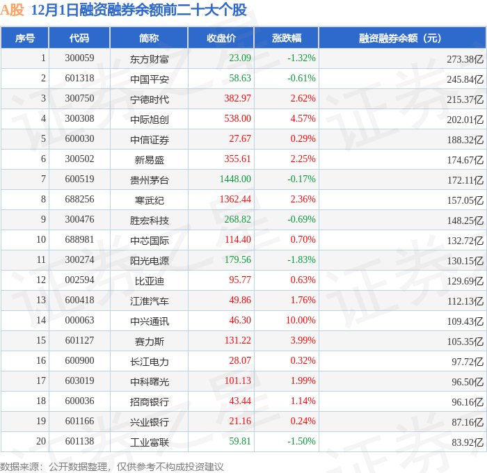 A股融资融券余额前三分别为:东方财富(300059)融资融券余额273.38亿元、中国平安(601318)融资融券余额245.84亿元、宁德时代(300750)融资融券余额215.37亿元,前20具体见下表: