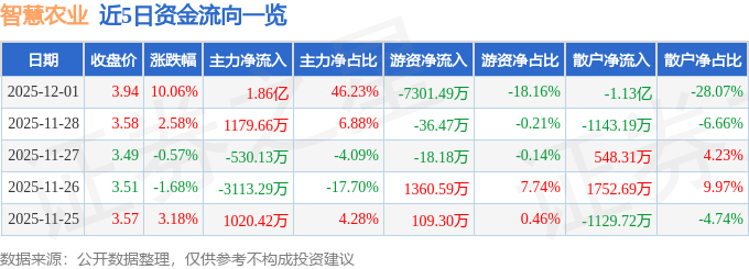证券之星消息,截至2025年12月1日收盘,智慧农业(000816)报收于3.94元,上涨10.06%,涨停,换手率7.19%,成交量103.34万手,成交额4.02亿元。