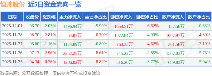 证券之星消息,截至2025年12月1日收盘,恒帅股份(300969)报收于96.7元,下跌2.03%,换手率8.51%,成交量2.58万手,成交额2.5亿元。