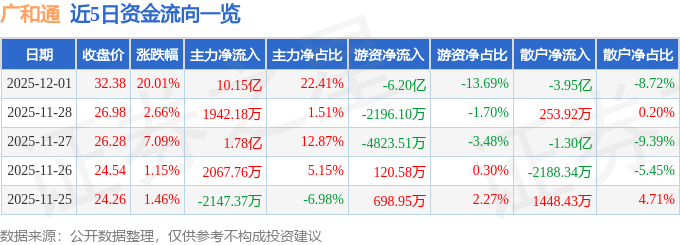 证券之星消息,截至2025年12月1日收盘,广和通(300638)报收于32.38元,上涨20.01%,涨停,换手率27.35%,成交量145.74万手,成交额45.28亿元。