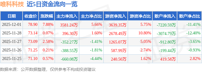 证券之星消息,截至2025年12月1日收盘,唯科科技(301196)报收于78.9元,上涨7.88%,换手率6.63%,成交量8.26万手,成交额6.33亿元。
