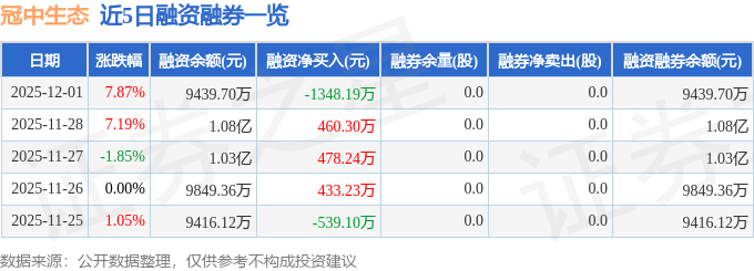 冠中生态融资融券信息显示,融资方面,当日融资买入3402.29万元,融资偿还4750.48万元,融资净偿还1348.19万元。融券方面,融券卖出0.0股,融券偿还0.0股,融券余量0.0股,融券余额0.0万元。融资融券余额9439.7万元。