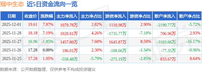 证券之星消息,截至2025年12月1日收盘,冠中生态(300948)报收于19.61元,上涨7.87%,换手率13.21%,成交量19.78万手,成交额3.83亿元。