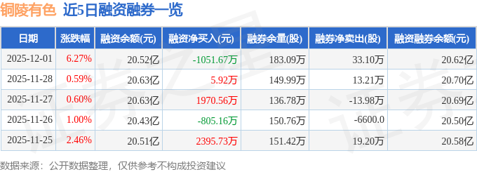 证券之星消息,截至2025年12月1日收盘,铜陵有色(000630)报收于5.42元,上涨6.27%,换手率4.25%,成交量473.83万手,成交额25.7亿元。