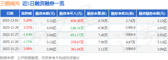 三钢闽光融资融券信息显示,融资方面,当日融资买入5536.03万元,融资偿还4677.73万元,融资净买入858.3万元。融券方面,融券卖出4.11万股,融券偿还1.37万股,融券余量9.7万股,融券余额44.62万元。融资融券余额3.12亿元。