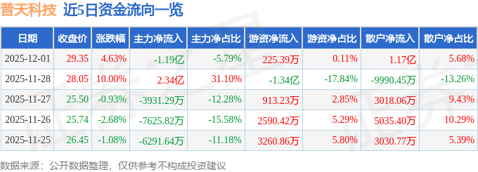 证券之星消息,截至2025年12月1日收盘,普天科技(002544)报收于29.35元,上涨4.63%,换手率10.4%,成交量70.75万手,成交额20.58亿元。