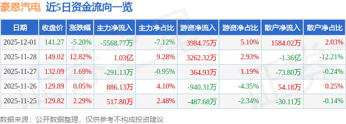 证券之星消息,截至2025年12月1日收盘,豪恩汽电(301488)报收于141.27元,下跌5.2%,换手率23.63%,成交量5.53万手,成交额7.82亿元。