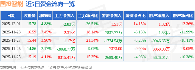 证券之星消息,截至2025年12月1日收盘,国投智能(300188)报收于15.78元,下跌4.88%,换手率8.07%,成交量69.02万手,成交额10.67亿元。