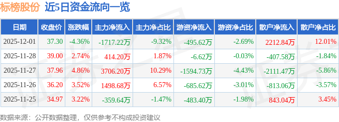 证券之星消息,截至2025年12月1日收盘,标榜股份(301181)报收于37.3元,下跌4.36%,换手率5.44%,成交量4.9万手,成交额1.84亿元。