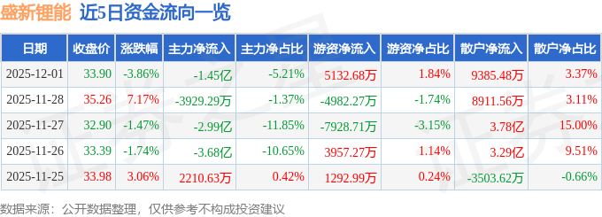 证券之星消息,截至2025年12月1日收盘,盛新锂能(002240)报收于33.9元,下跌3.86%,换手率9.28%,成交量80.41万手,成交额27.89亿元。