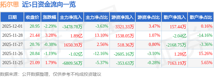 证券之星消息,截至2025年12月1日收盘,拓尔思(300229)报收于20.95元,下跌2.29%,换手率5.24%,成交量45.78万手,成交额9.58亿元。
