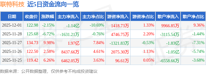 证券之星消息,截至2025年12月1日收盘,联特科技(301205)报收于122.98元,下跌2.15%,换手率12.71%,成交量8.64万手,成交额10.65亿元。