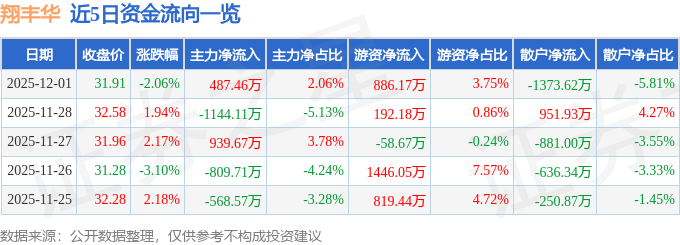 证券之星消息,截至2025年12月1日收盘,翔丰华(300890)报收于31.91元,下跌2.06%,换手率6.77%,成交量7.36万手,成交额2.37亿元。