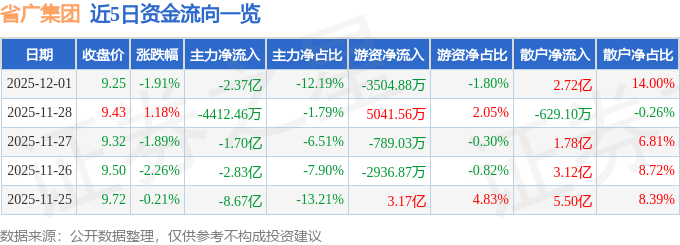 证券之星消息,截至2025年12月1日收盘,省广集团(002400)报收于9.25元,下跌1.91%,换手率12.06%,成交量208.17万手,成交额19.42亿元。