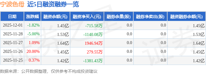 宁波色母融资融券信息显示,融资方面,当日融资买入2150.55万元,融资偿还2866.12万元,融资净偿还715.58万元。融券方面,融券卖出0.0股,融券偿还0.0股,融券余量0.0股,融券余额0.0万元。融资融券余额1.45亿元。