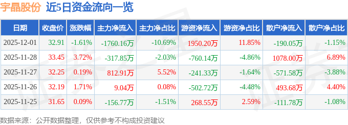 证券之星消息,截至2025年12月1日收盘,宇晶股份(002943)报收于32.91元,下跌1.61%,换手率3.75%,成交量4.96万手,成交额1.65亿元。