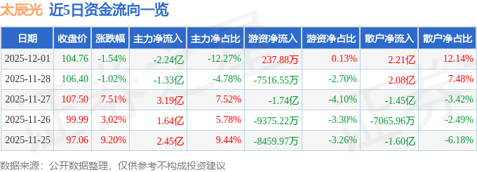 证券之星消息,截至2025年12月1日收盘,太辰光(300570)报收于104.76元,下跌1.54%,换手率9.05%,成交量17.4万手,成交额18.24亿元。