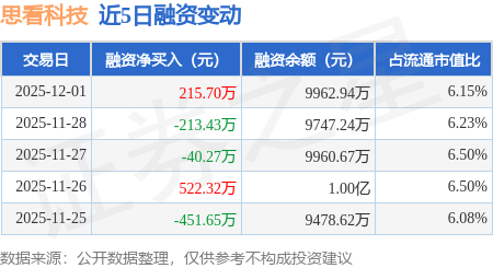 证券之星消息,12月1日,思看科技(688583)融资买入1197.62万元,融资偿还981.92万元,融资净买入215.7万元,融资余额9962.94万元。