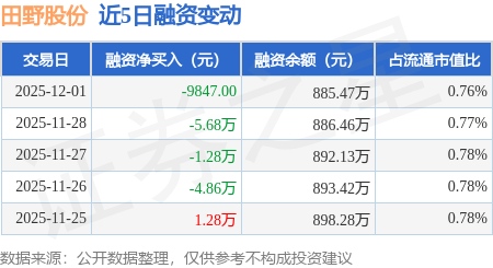 证券之星消息,12月1日,田野股份(920023)融资买入5.43万元,融资偿还6.42万元,融资净卖出0.98万元,融资余额885.47万元。