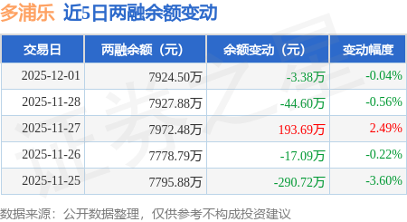 证券之星消息,12月1日,多浦乐(301528)融资买入335.74万元,融资偿还339.12万元,融资净卖出3.38万元,融资余额7924.5万元,近20个交易日中有11个交易日出现融资净买入。