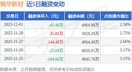 证券之星消息,12月1日,锦华新材(920015)融资买入789.99万元,融资偿还835.39万元,融资净卖出45.4万元,融资余额4964.9万元,近20个交易日中有11个交易日出现融资净买入。