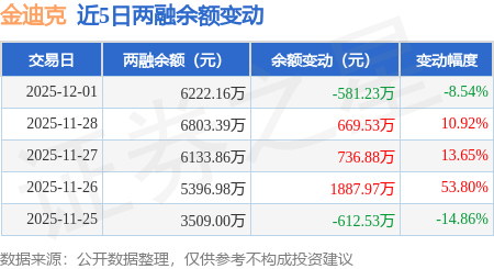 证券之星消息,12月1日,金迪克(688670)融资买入2305.67万元,融资偿还2886.9万元,融资净卖出581.23万元,融资余额6222.16万元,近20个交易日中有11个交易日出现融资净买入。