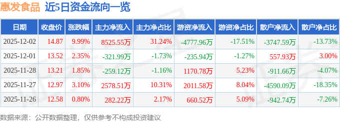 证券之星消息,截至2025年12月2日收盘,惠发食品(603536)报收于14.87元,上涨9.99%,涨停,换手率8.02%,成交量19.29万手,成交额2.73亿元。