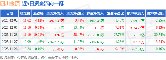 证券之星消息,截至2025年12月2日收盘,四川金顶(600678)报收于11.62元,上涨4.12%,换手率33.64%,成交量117.39万手,成交额13.41亿元。