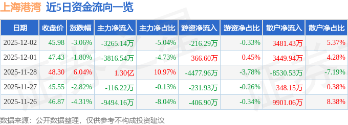 证券之星消息,截至2025年12月2日收盘,上海港湾(605598)报收于45.98元,下跌3.06%,换手率5.79%,成交量14.08万手,成交额6.48亿元。
