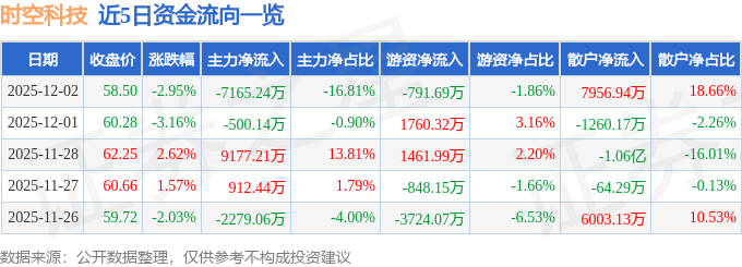证券之星消息,截至2025年12月2日收盘,时空科技(605178)报收于58.5元,下跌2.95%,换手率7.25%,成交量7.18万手,成交额4.26亿元。