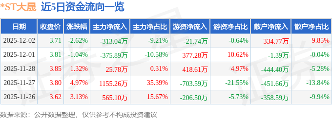 证券之星消息,截至2025年12月2日收盘,*ST大晟(600892)报收于3.71元,下跌2.62%,换手率1.63%,成交量9.12万手,成交额3398.25万元。