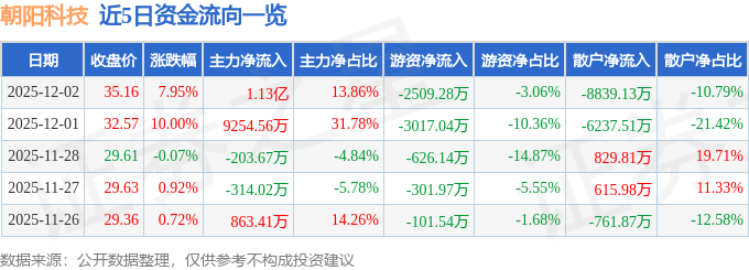 证券之星消息,截至2025年12月2日收盘,朝阳科技(002981)报收于35.16元,上涨7.95%,换手率19.53%,成交量23.32万手,成交额8.19亿元。