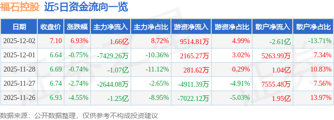 证券之星消息,截至2025年12月2日收盘,福石控股(300071)报收于7.1元,上涨6.93%,换手率29.19%,成交量275.97万手,成交额19.06亿元。